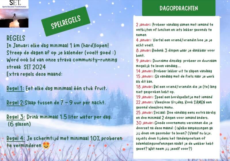 Word lid van de running streak SET club op Strava (zie link hierboven) en loop dagelijks minimaal 1 kilometer hard (wandelen mag ook) en registreer jouw loopje in Strava als "Running Streak SET Dag X’.